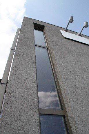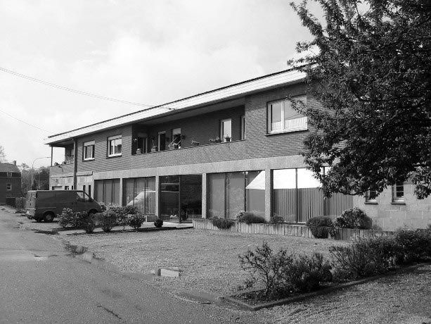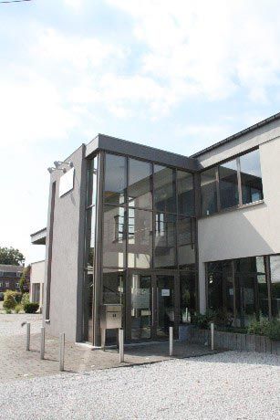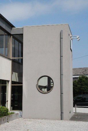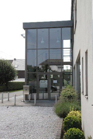 L’ensemble de la façade principale d’accueil est revu : les matériaux hétéroclites d’origine sont recouverts d’un cimentage et d’un crépi de deux teintes afin de souligner les différents plans de la façade.